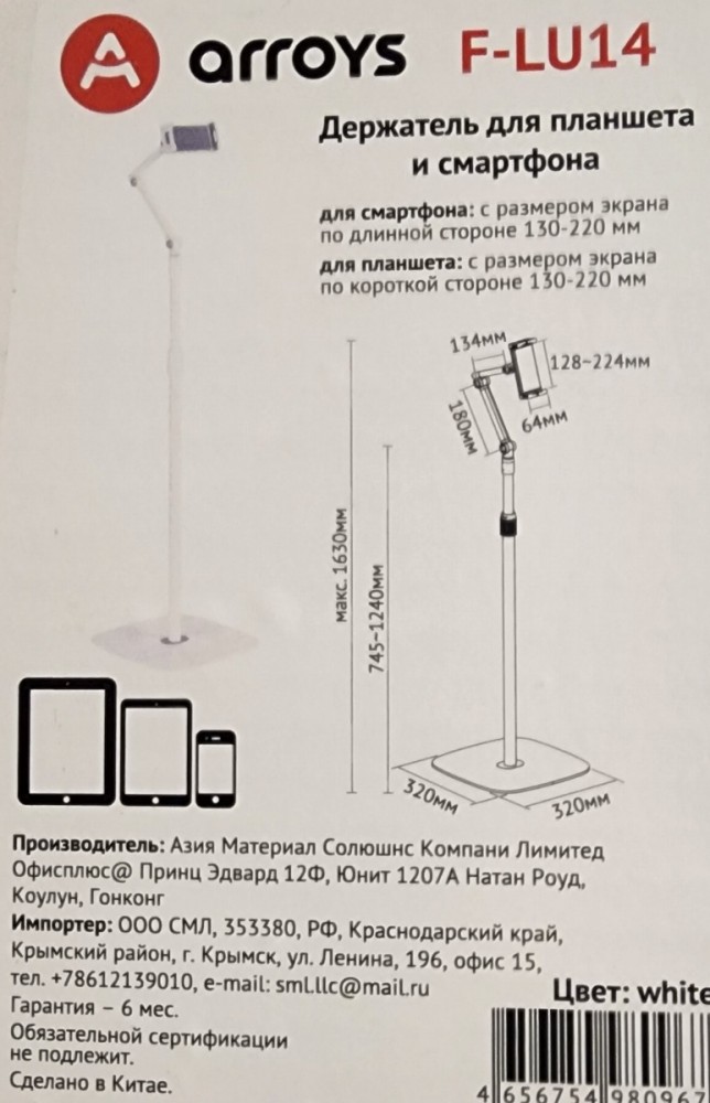 подставка напольная для планшета Arroys F-LU14 white