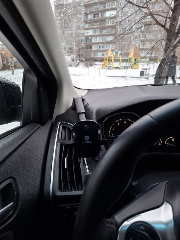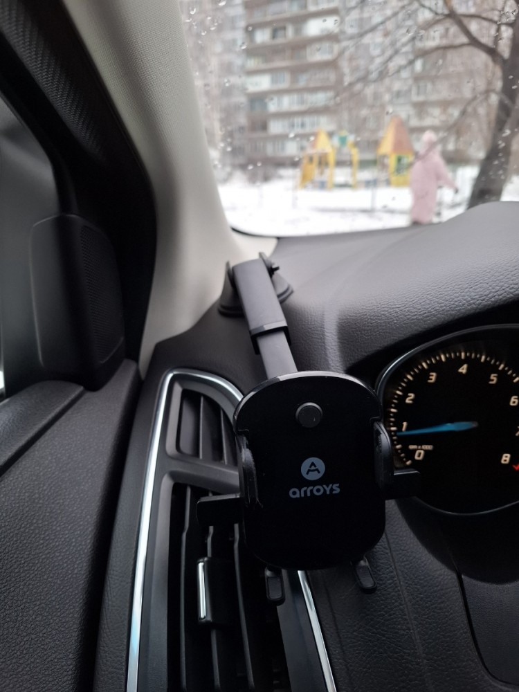 Автомобильный держатель Arroys Dash-MT2 крепится на лобовое стекло или приборную панель с помощью вакуумной присоски диаметром примерно 65 мм. Зажим смартфона автоматический. При установке в держатель корпус смартфона нажимает на кнопку и зажим закрывается автоматически. Для извлечения смартфона из держателя необходимо нажать кнопки сбоку. Все это делается очень удобно одной рукой. Если экран девайса широкий, то надо на кнопки надеть удлинительные колпачки. Держатель совместим со смартфонами с экраном шириной от 55 до 95. мм.