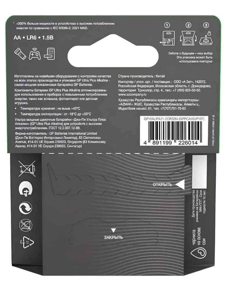Щелочные, пальчиковые батарейки (4 шт.) GP Ultra Plus G-tech LR6/AA-4BL — это новейшая разработка в области щелочных батареек, которая предлагает повышенную производительность и экологичность. Элементы питания содержат высокоплотный цинковый порошок S, который вырабатывает на 200% больше мощности для игрушек с электроприводом по сравнению с отраслевым стандартом