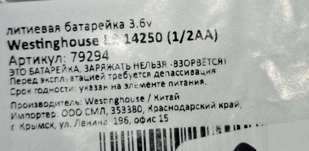 Внимание! Элемент питания Westinghouse ER 14250 (1/2AA) рассчитан на напряжение 3.6 В и не предназначен для перезарядки. НЕ ЗАМЕНЯТЬ им 1.2В, 1.5В, алкалиновые, никель-кадмиевые (Ni-Cd) или никель-металлогидридные (Ni-Mh) элементы питания, а также 3.2В или 3.7 В литиевые батарейки